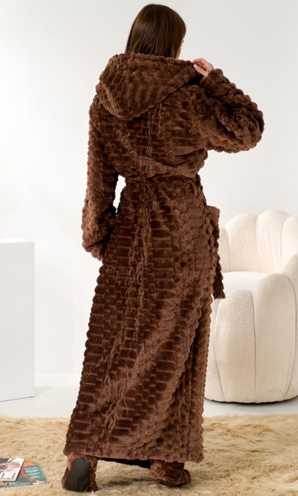 Халат довгий, з капюшоном, є дві кишені, пояс