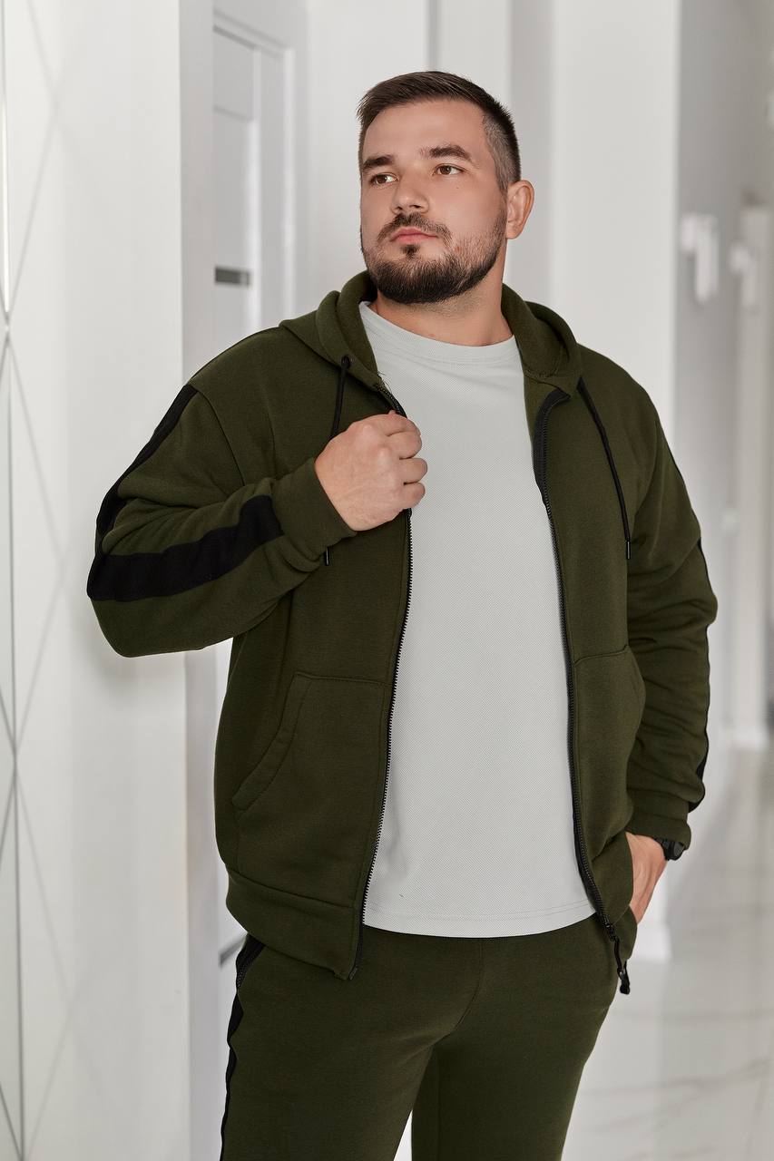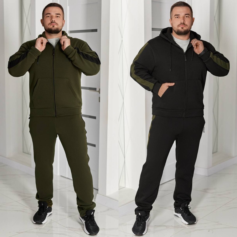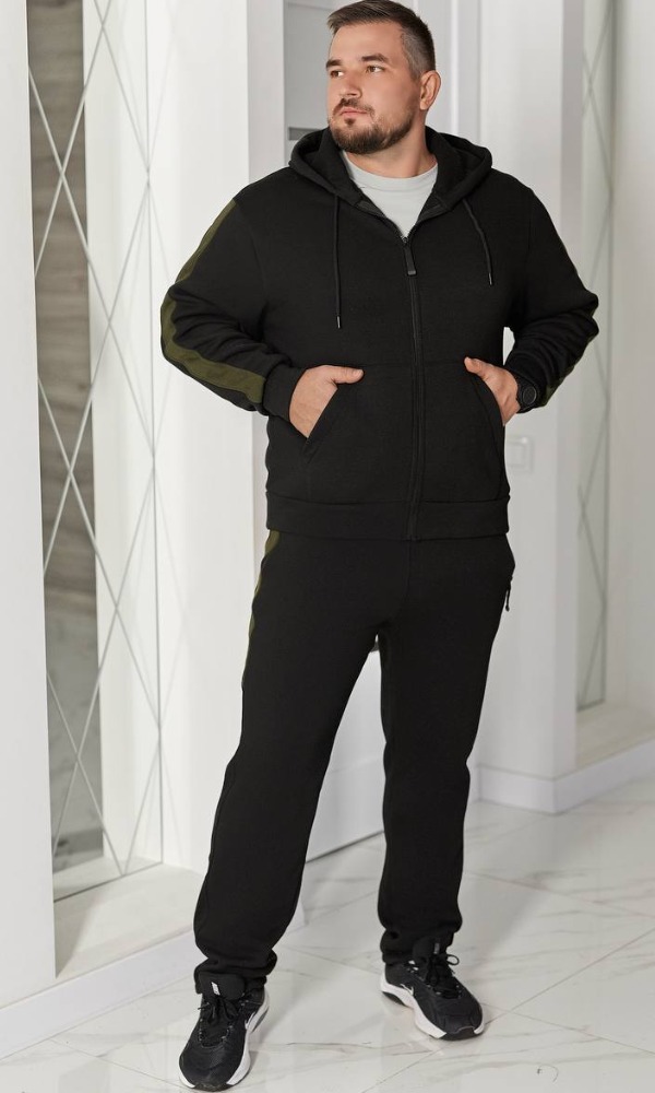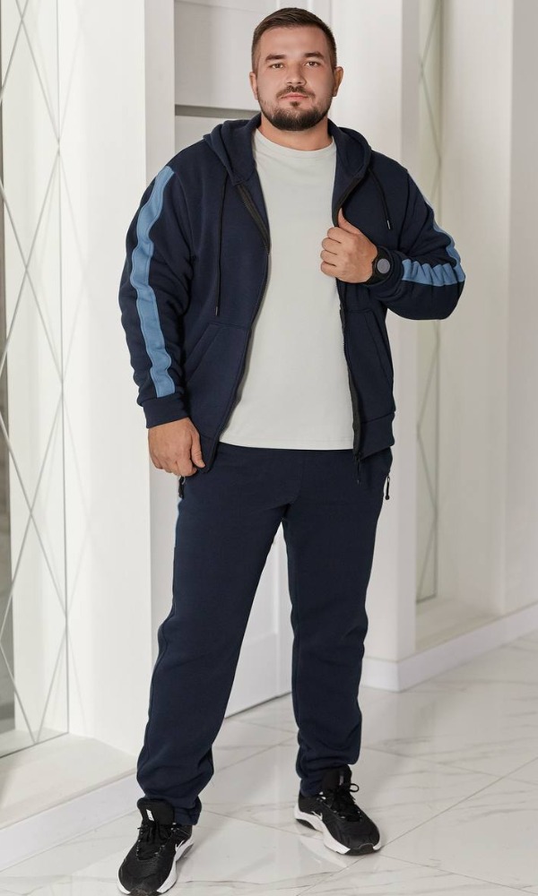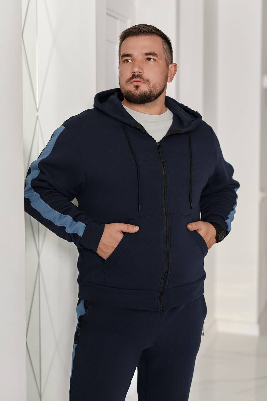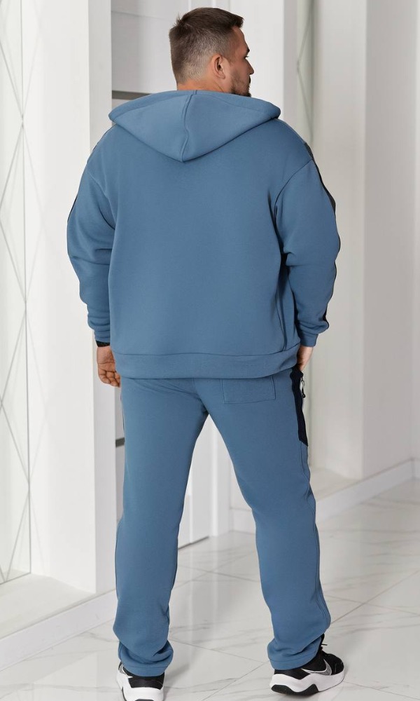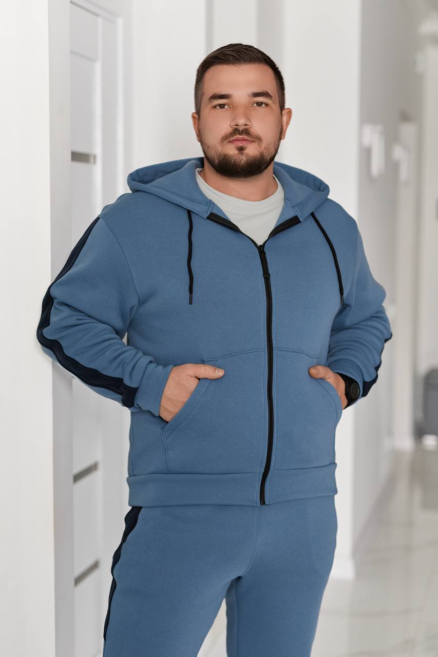 Худі прямого силуету, з капюшоном зі шнурками на блискавці. Низ та рукави на трикотажному манжеті. Контрастні лампаси на рукавах і штанах