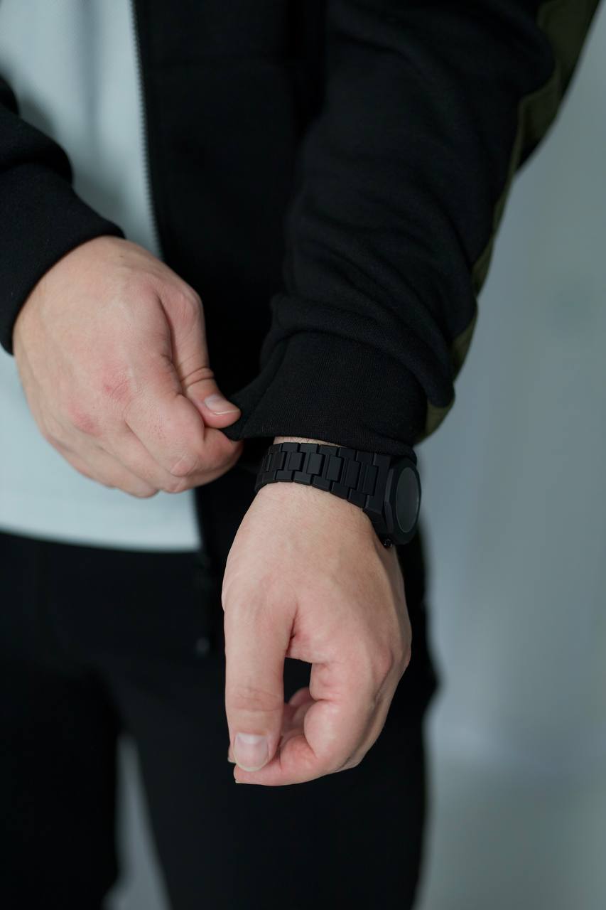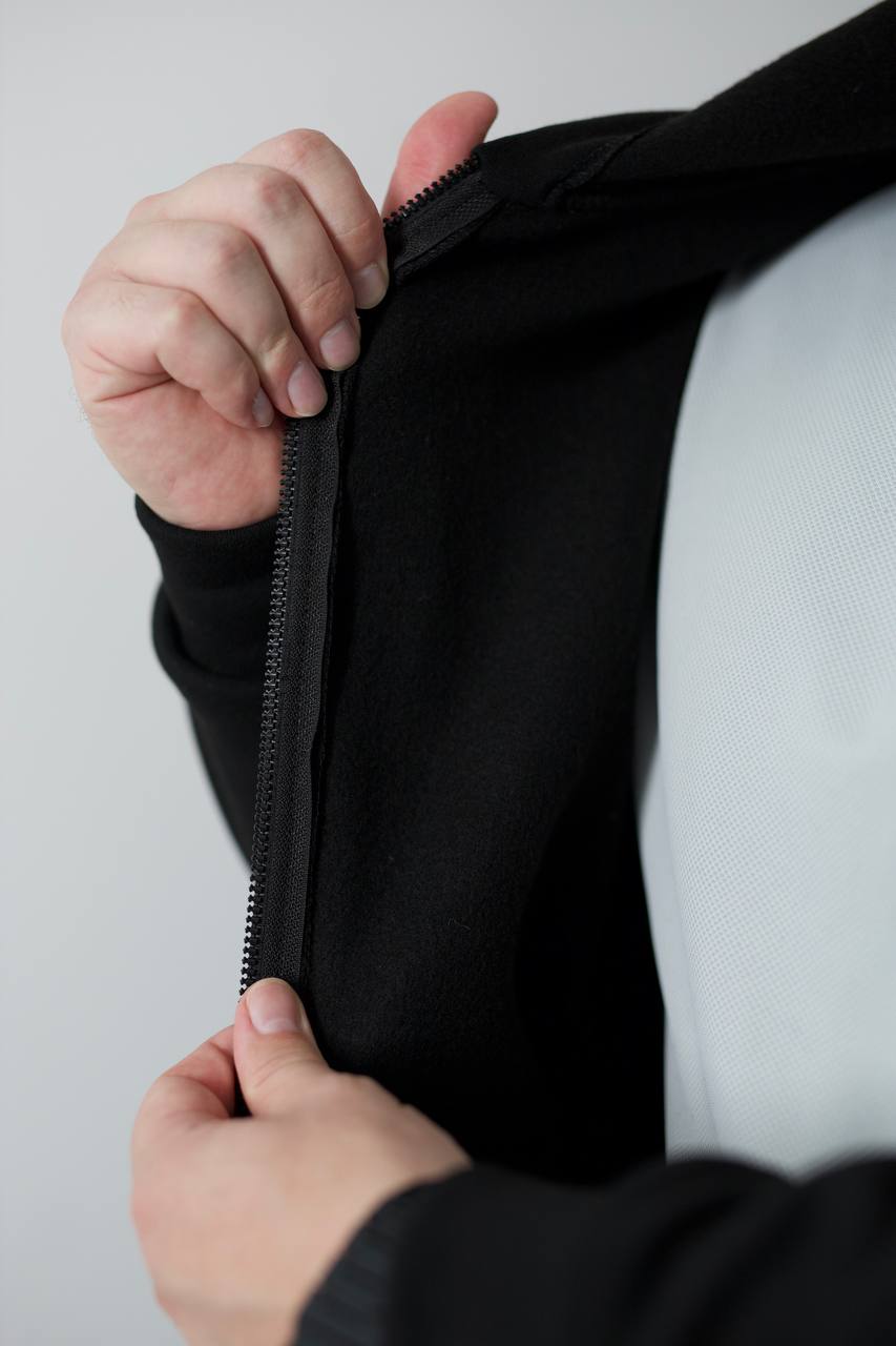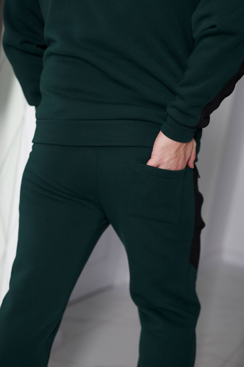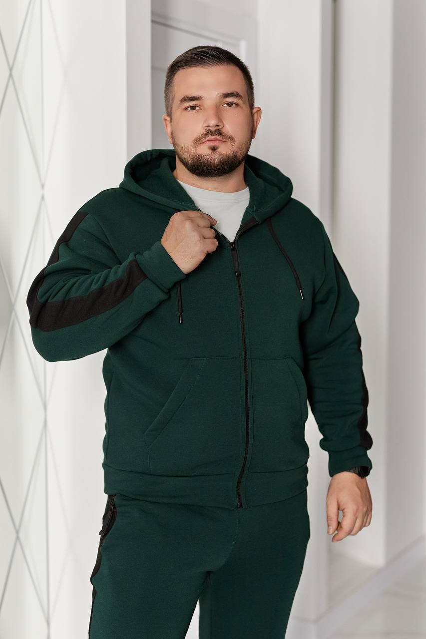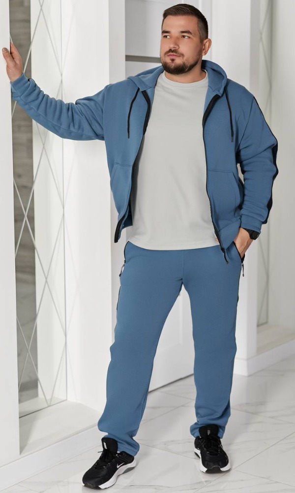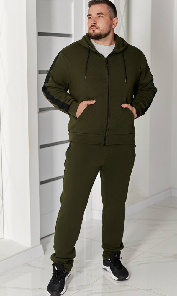 Худі прямого силуету, з капюшоном зі шнурками на блискавці. Низ та рукави на трикотажному манжеті. Контрастні лампаси на рукавах і штанах