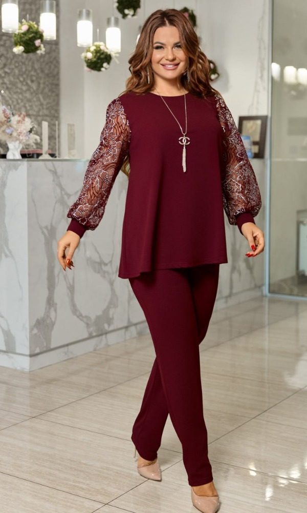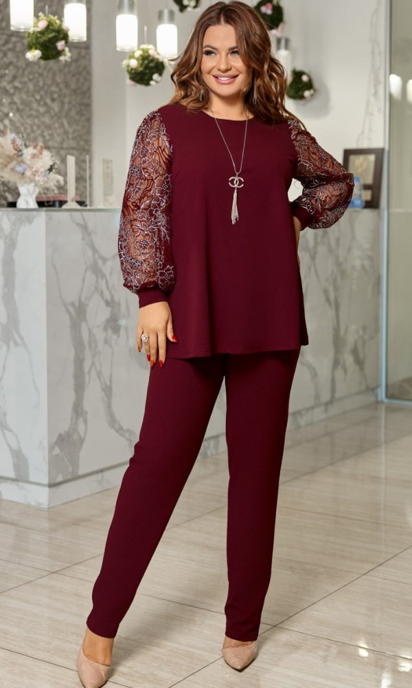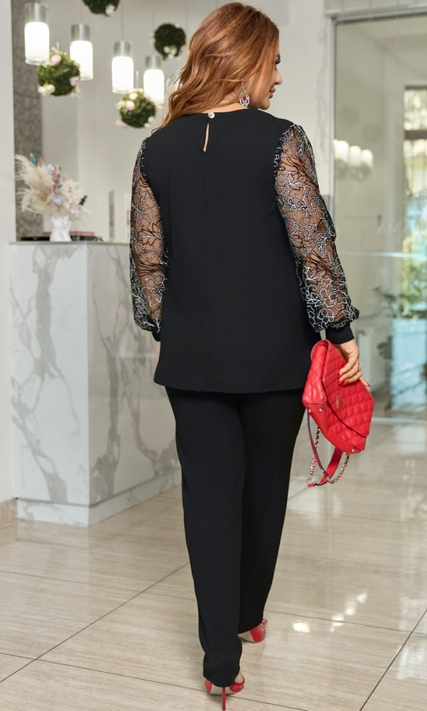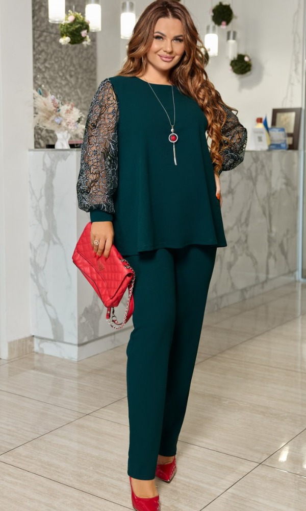 Костюм жіночий брючний костюм, від 50 до 60 р, блуза з мереживними рукавамиКостюм жіночий брючний костюм, великого розміру, від 50 до 60 р, стильний, ошатний, П-7151/187