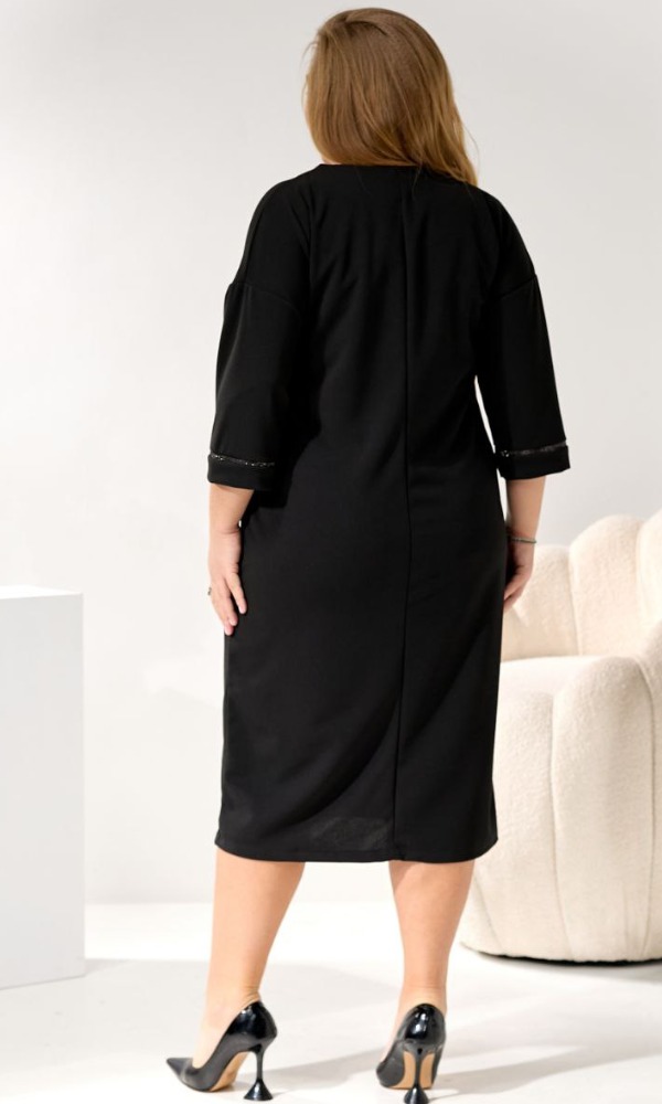 Елегантна, лаконічна сукня, тонка смужка з впаяного каміння на стрічці, витягує сілует. Прямий крій, V- образний виріз горловини, рукав 3/4.